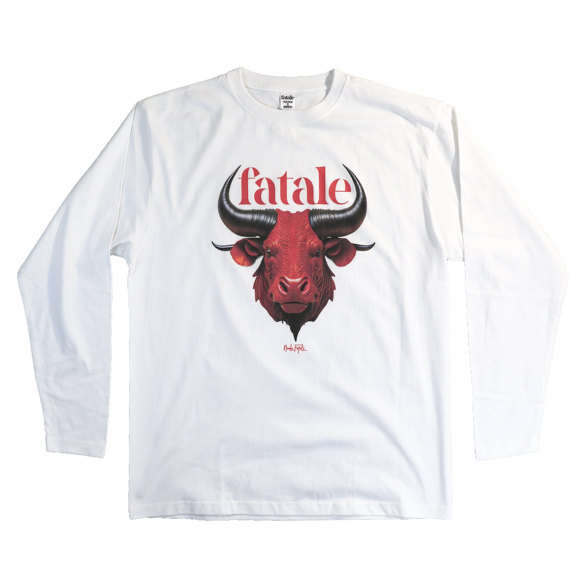 The ReBu Sweater in White epitomizes sophistication with its nearly seamless cut. The front showcases a striking Rough-Vintage print featuring a red bull and the "Fatale" script in the collection's signature color.